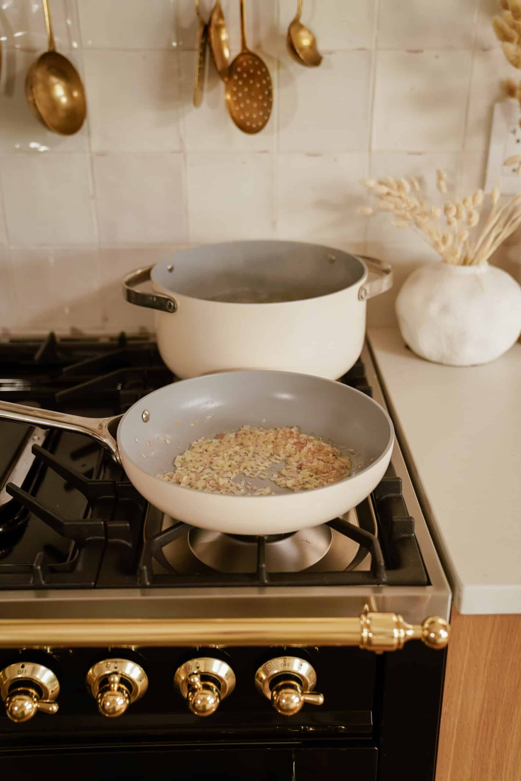 - In a large saucepan, heat the butter, garlic and shallot over medium heat. Cook until softened, 3-5 minutes.
