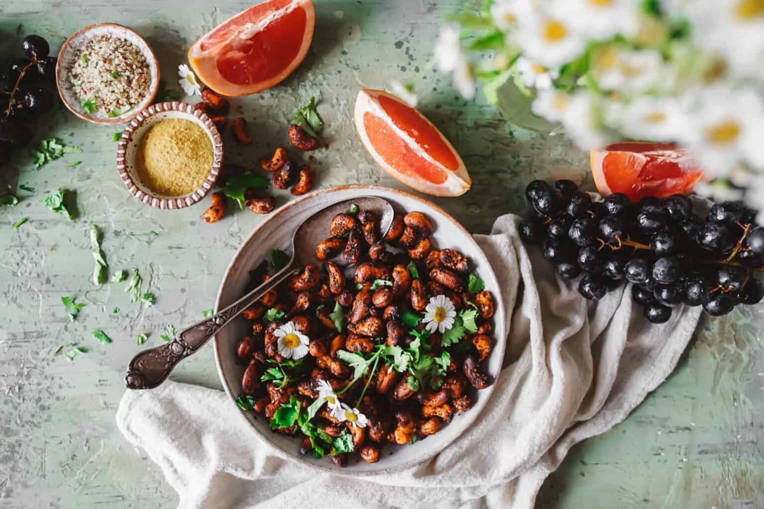These Sweet + Spicy Crispy Cashews combine raw cashews with a maple‑soy‑lime marinade, nutritional yeast, garlic, onion, smoked paprika, chili, and a hint of liquid smoke for a crunchy, flavor‑packed snack that’s sweet, smoky, and lightly spicy.