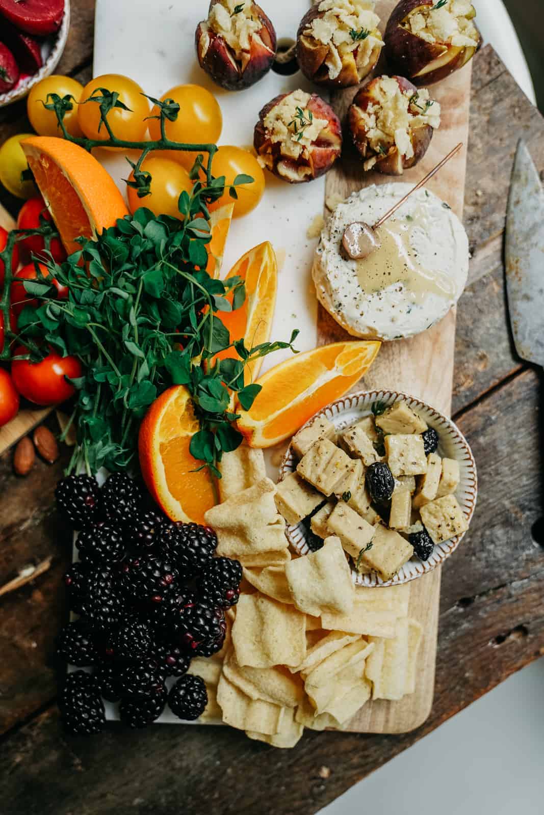 Place the figs on a lightly greased, parchment tray or baking sheet. Stuff each fig with 1 walnut and 1 tsp vegan feta. Top with chips and broil for around 5 minutes or until the cheese looks softer and more gooey-like.